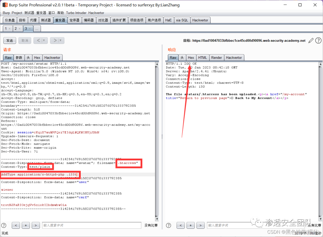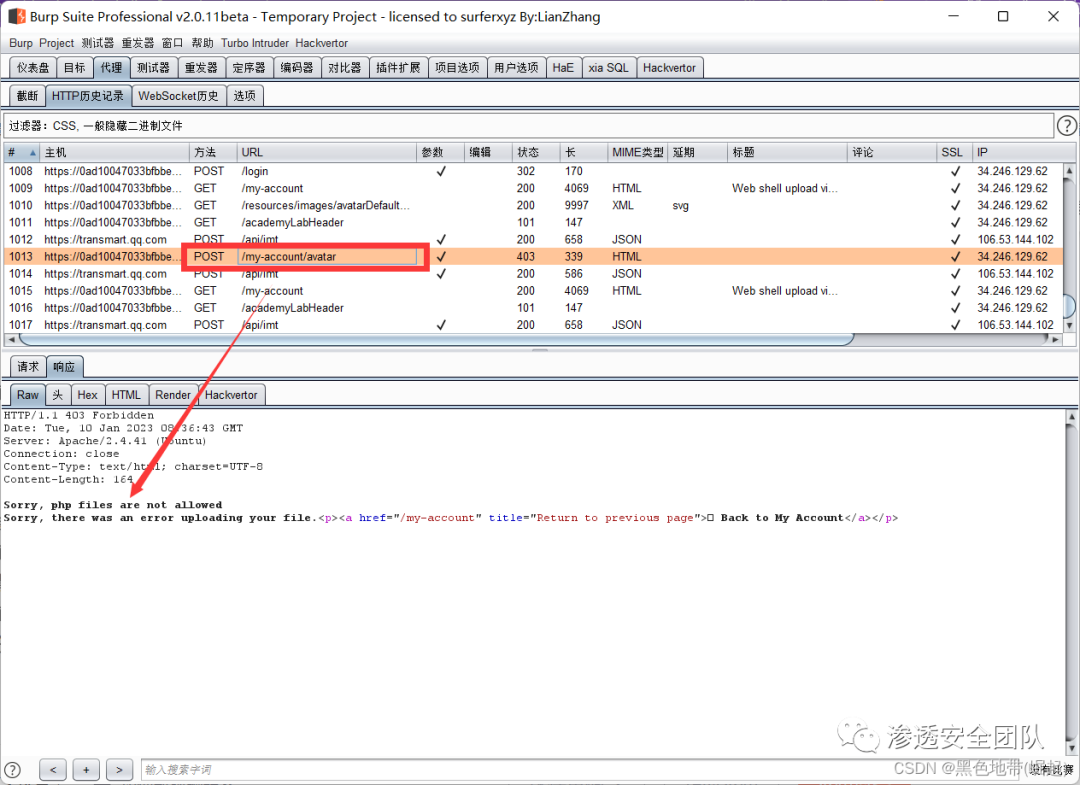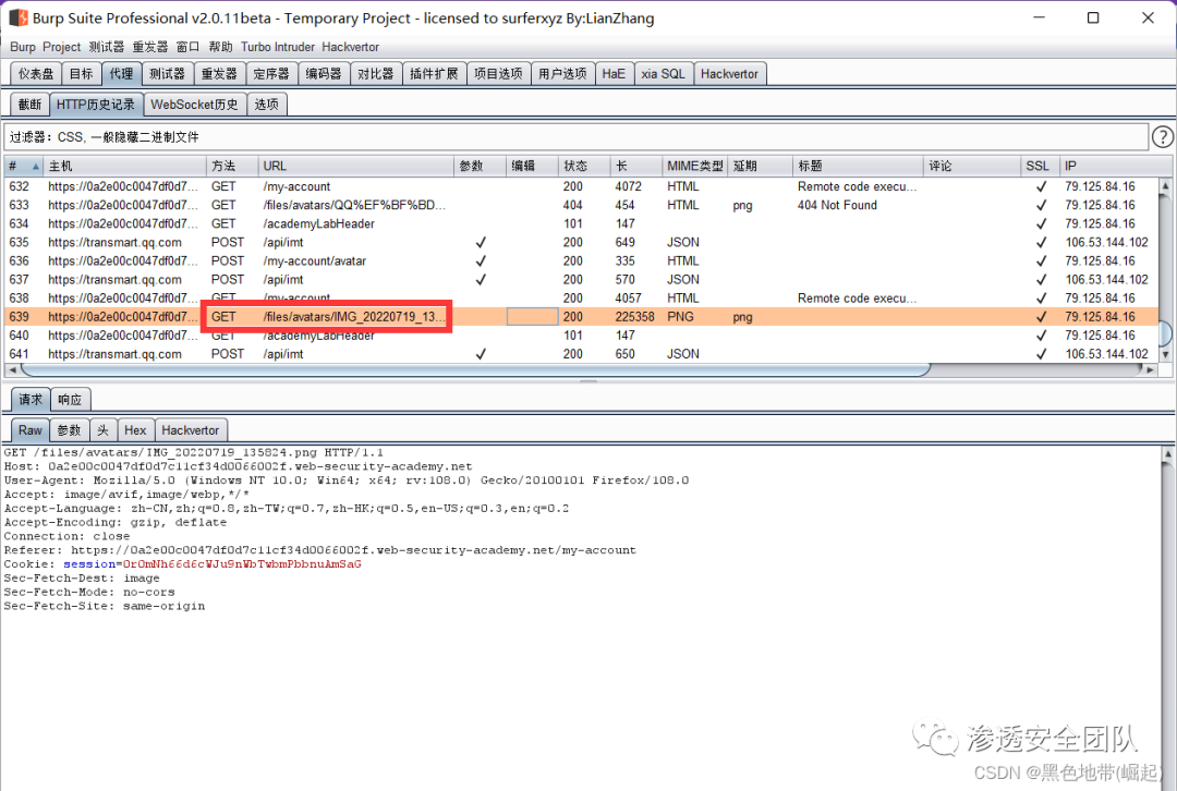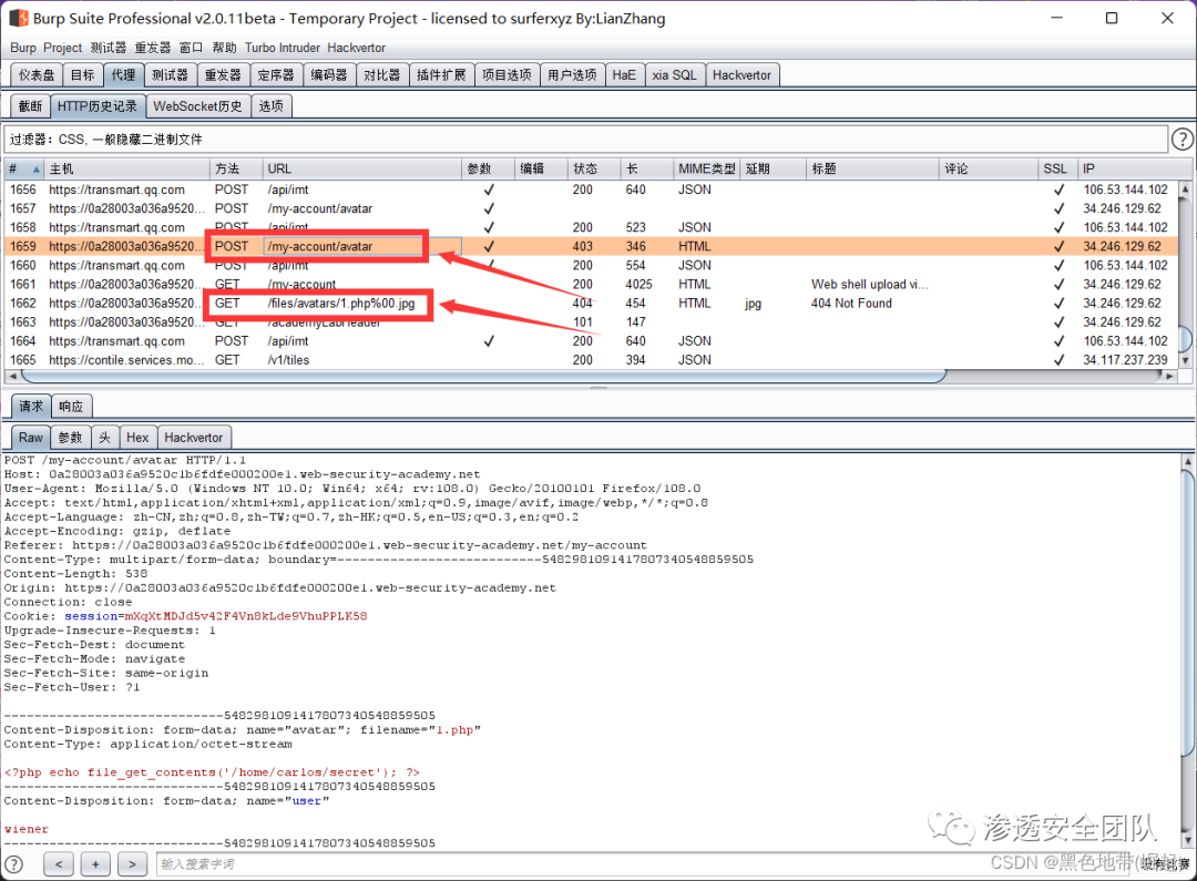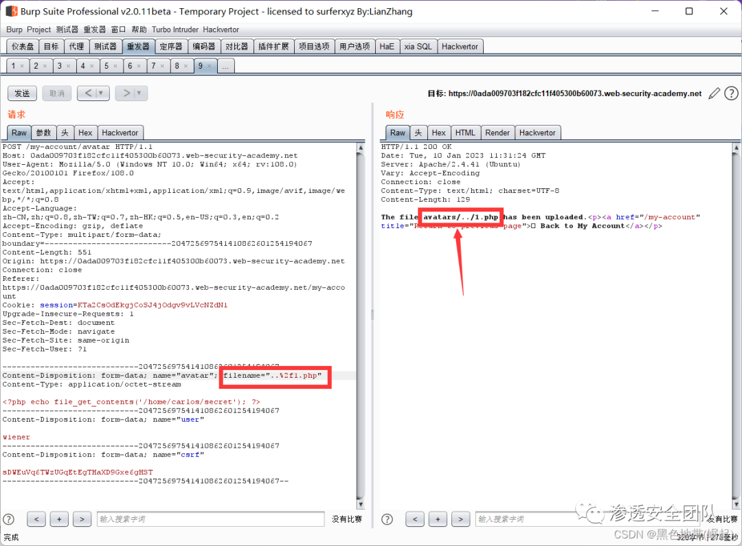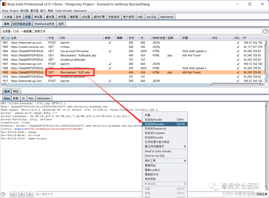 在Burp的HTTP历史记录中,找到用于提交文件上传的POST/my-account/avatar请求。把这个发给repeater