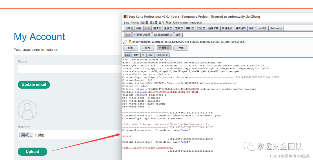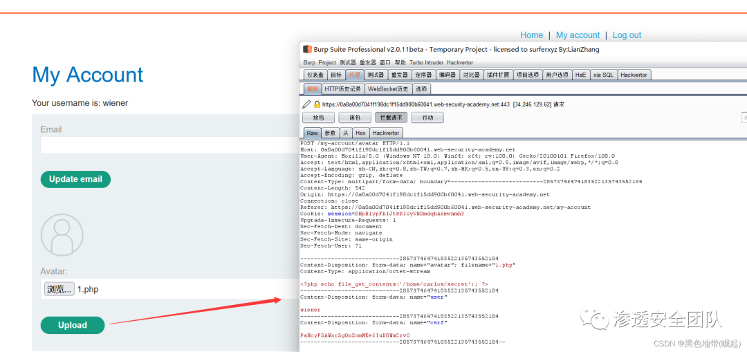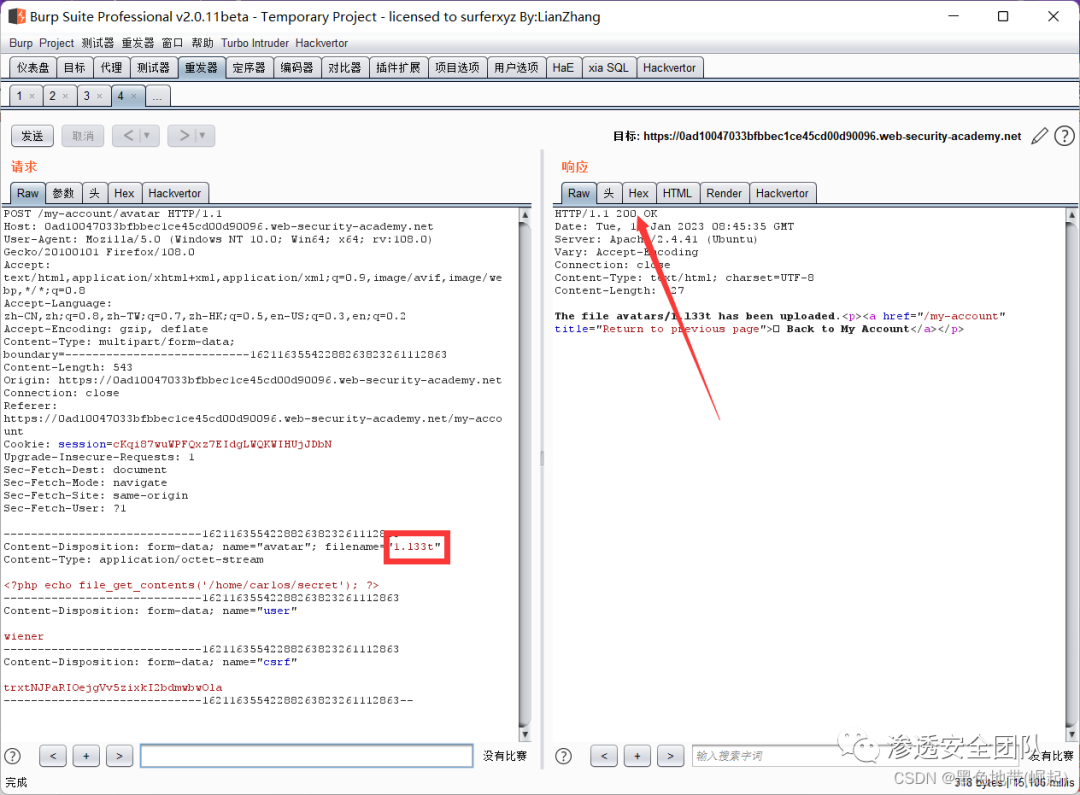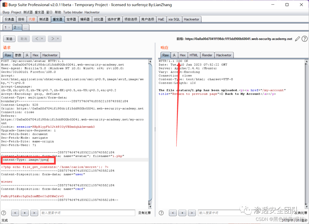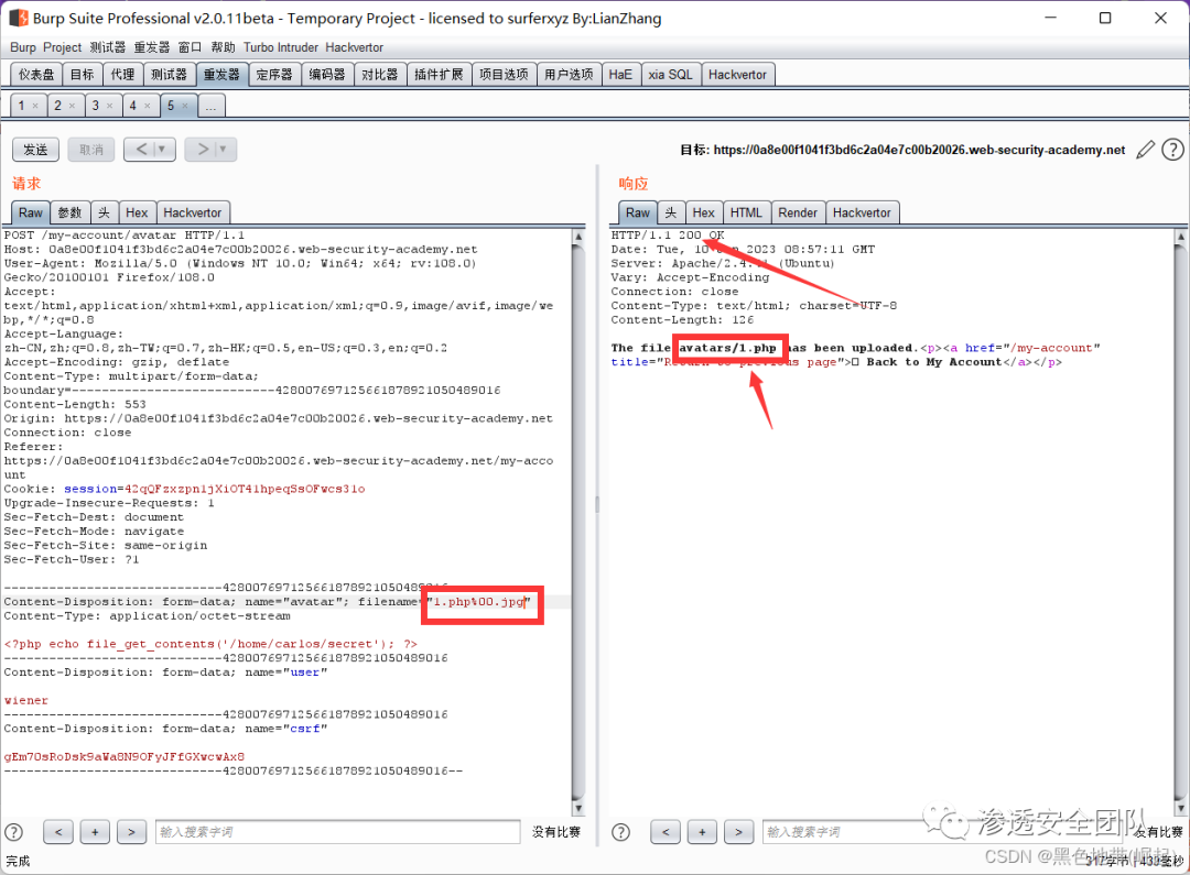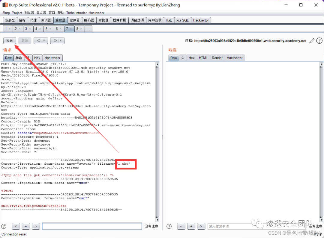 在Burp Repeater中,转到POST/my-account/avatar请求的选项卡,找到与PHP文件相关的身体部分。