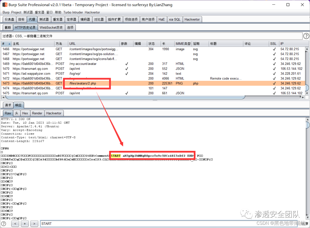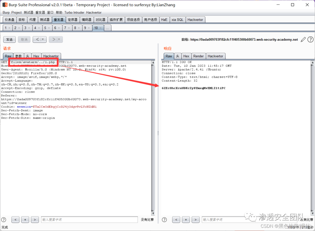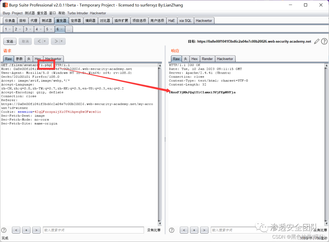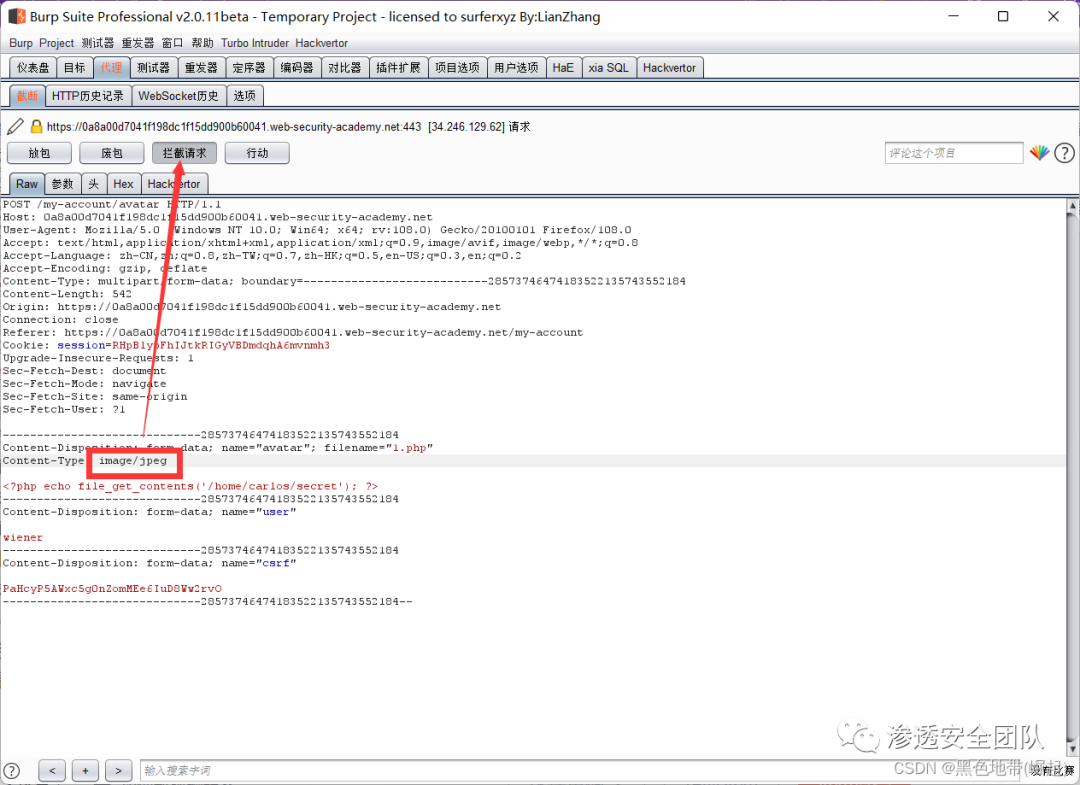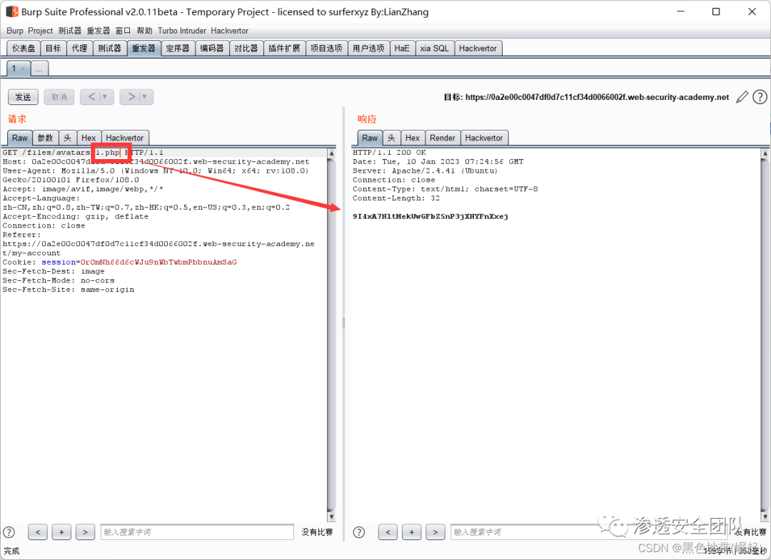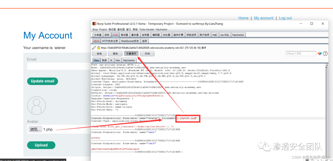 在Burp Repeater中,转到POST/my-account/avatar请求的选项卡,找到与PHP文件相关的身体部分。