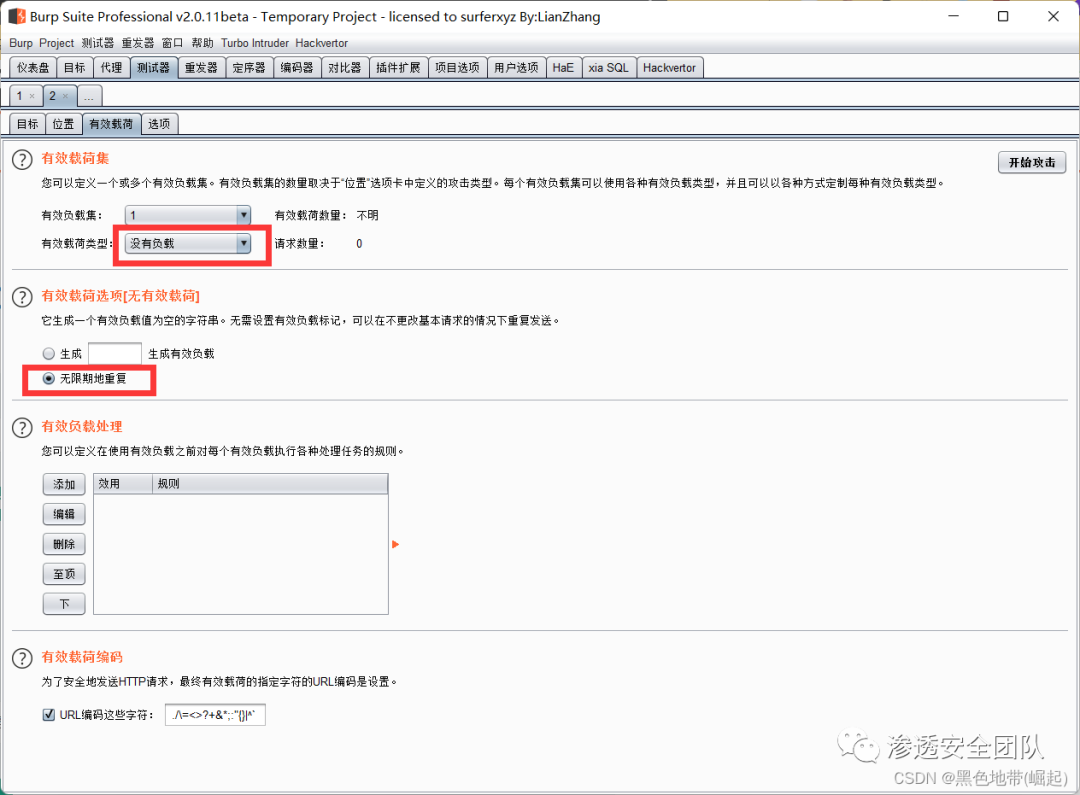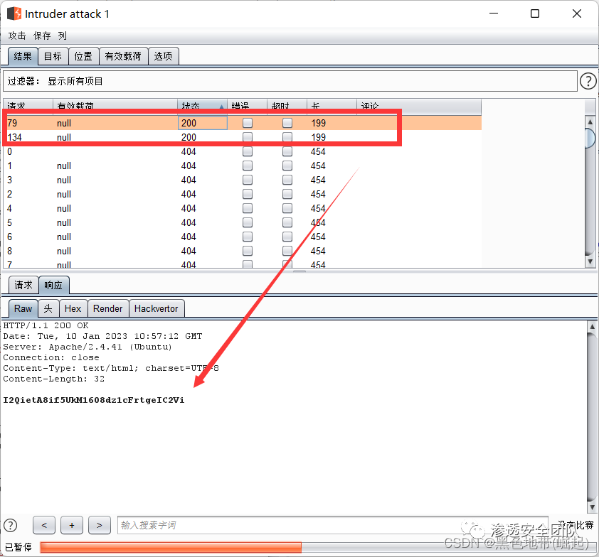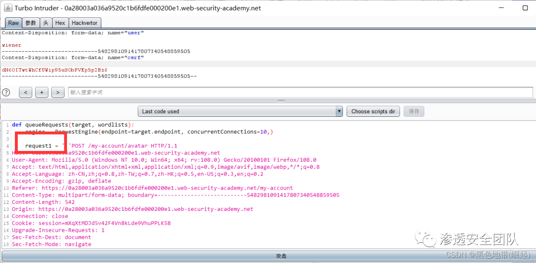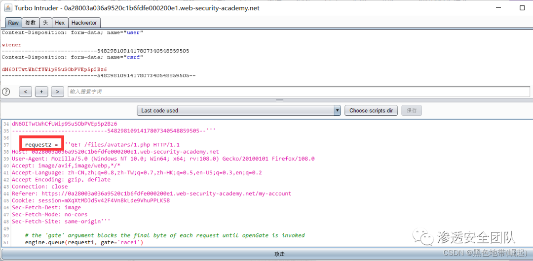 3、在Turbo Intruder窗口底部,单击Attack(攻击)。这个脚本将提交一个POST请求来上传1.php文件,然后立即向/files/avatars/1.php提交5个GET请求。