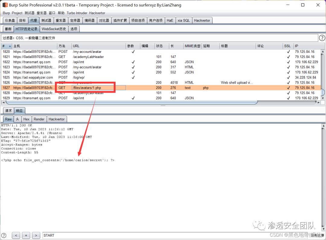 要解决实验问题,请上传一个基本的PHP Web shell,然后使用它对文件/home/carlos/secret的内容进行过滤并提交