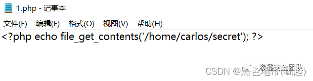 电脑上,创建一个php的文件,其中包含用于获取Carlos秘密文件内容的脚本(或者直接使用后门代码get shell),如: