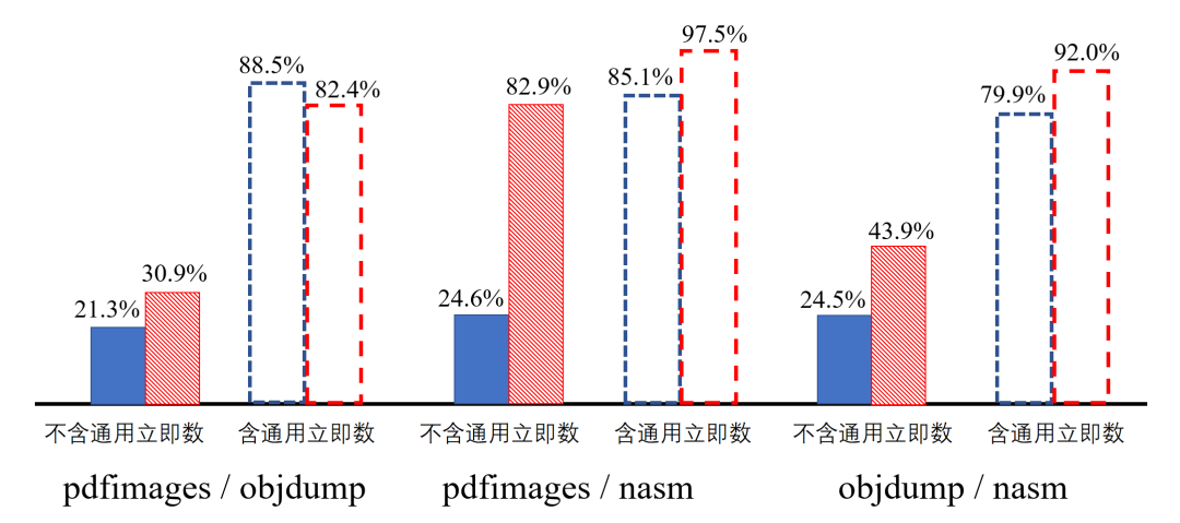 由图可知,程序间相同立即数使用比例很高。其中,pdfimages和nasm中相同立即数的使用次数占pdfimages总使用次数比例高达82.9%。如果将通用立即数计入实验结果,则所有分析中相同立即数的使用比例均达79.9%以上。