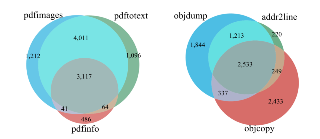 同一供应商提供的不同程序之间存在共享代码,相同的高效变异策略可以触发它们相似的分支行为。因此,我们使用MOPT对xpdf-4.02和binutils-2.28中的pdfimages、pdftotext、pdfinfo、objdump、addr2line和objcopy六个程序进行了长达5小时的测试,统计分析了各程序触发的执行路径中包含的基本块和共享基本块的数量,实验结果如图1.2所示。