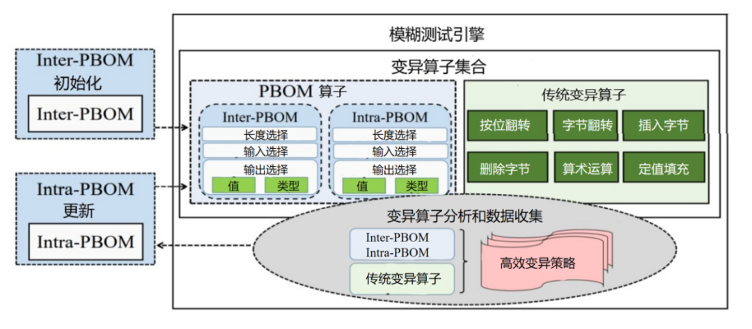 EMS旨在利用历史数据中的高效变异策略,根据给定来自种子文件的输入字节值,选择对应的有效策略来实施变异,改变输入字节值生成新的测试样例,从而提高模糊测试工具的路径和崩溃探索能力。整体上,EMS由Inter-PBOM初始化、PBOM算子构建、变异算子分析和数据收集、Intra-PBOM更新四个模块组成,构造了Inter-和Intra-PBOM来实现程序内和程序间的历史数据收集和复用,新增了PBOM算子来实现高效变异策略的应用。同时,EMS利用变异算子分析和数据收集模块来持续地收集测试过程中新积累的历史记录,并基于此定期调用Intra-PBOM更新模块进行模型更新。