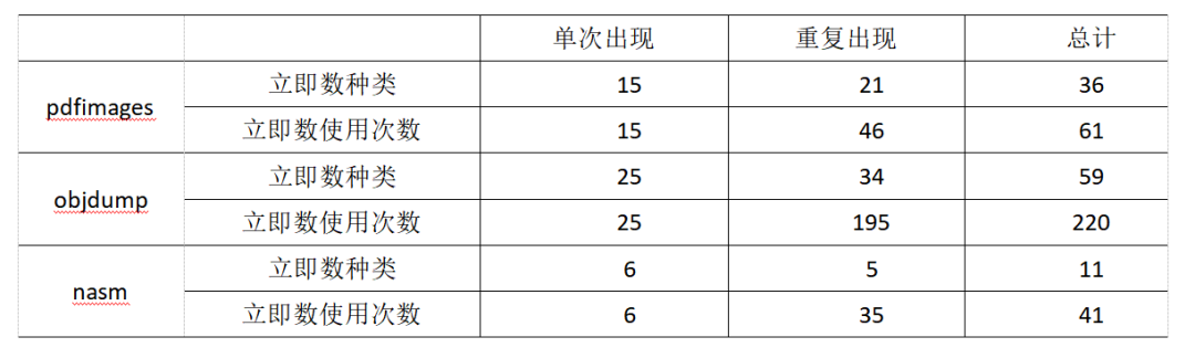 程序cmp指令中的立即数与路径约束密切相关,直接控制着程序的分支行为。因此,我们对pdfimages、objdump、nasm三个目标程序的汇编代码进行了分析,研究了汇编指令中cmp指令立即数种类及其使用次数情况,实验结果如表1.1所示。