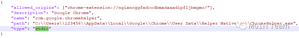 图9 mainfest.json配置文件显示了其注册信息,stdio表示使用标准输入输出与NativeApp.exe进行通讯