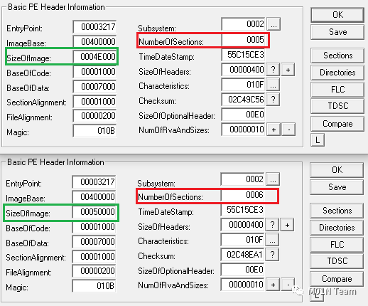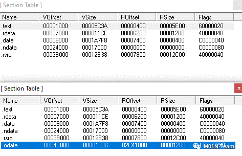 图3 原始程序被增加了一个新节(.odata)去用来存储恶意shellcode