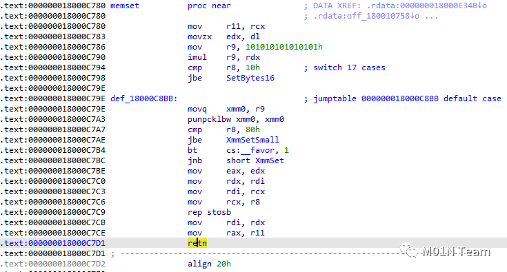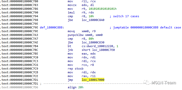 图8 修改后的memset函数,0x18000C7D被修改为jmp跳转到shellcode