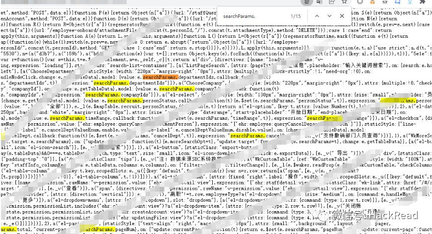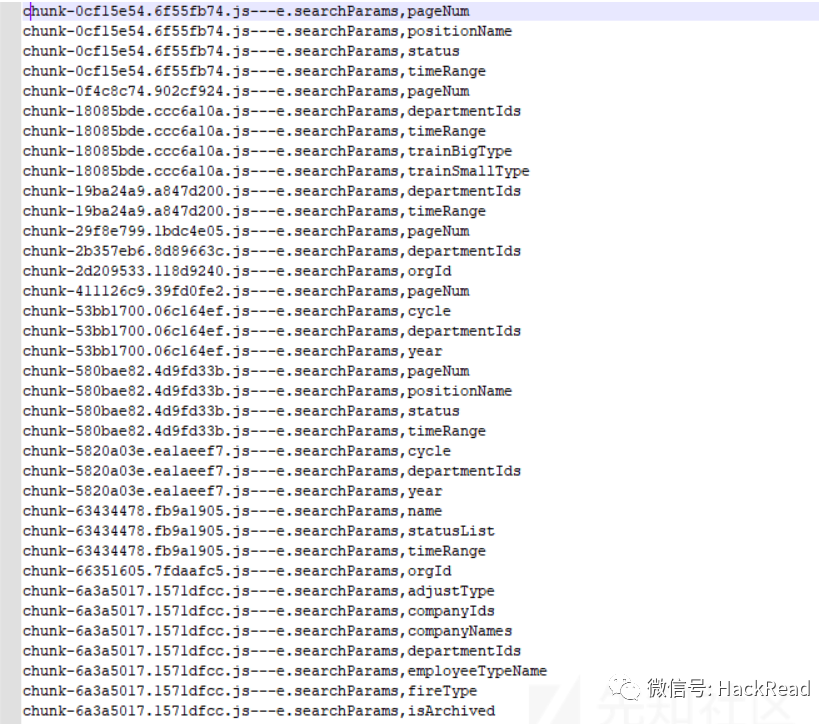 但是在一些JS里找到了searchParams字符串,这个字符串非常的可疑,很多JS文件里都有这个字符串,那么我们是不是可以批量提取一下这个字符串,然后将其变成参数呢?