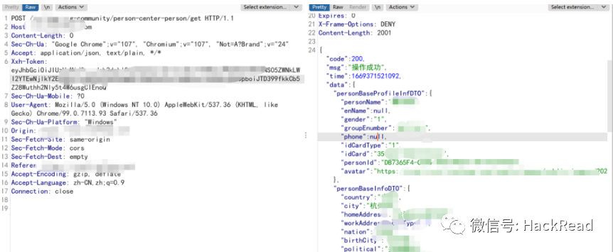 之后变换成get请求,发现某些接口直接就返回了大量的数据,如下两个接口,其中一个接口直接返回了当前我自己的信息,而且信息非常的多。根据个人经验,这种返回persion信息的地方常常都有参数可遍历,而默认情况就是返回自身数据。