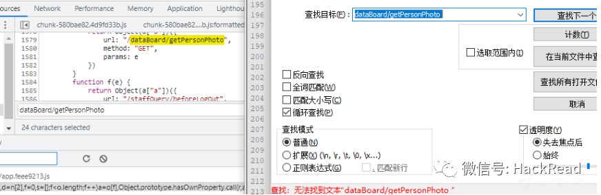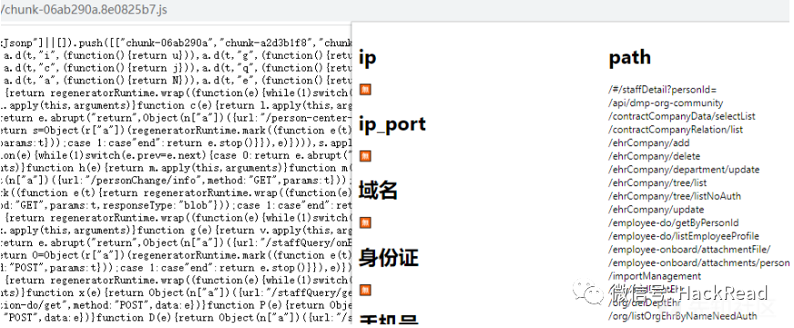 随便打开了一个chunk-xxxxxx.js,利用插件发现存在一些路径但是在F12里搜不到,也就意味着这么多个chunk我要一个个打开看,才能够测试得比较仔细。