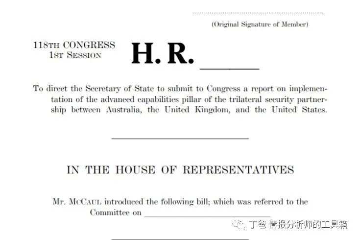 1、麦考尔提出《AUKUS伙伴关系法》,指示国务卿向国会提交一份报告,说明澳大利亚、联合王国和美国之间三方安全伙伴关系的先进能力支柱的执行情况。