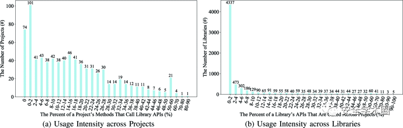 经研究发现,74(9.2%) 的项目没有调用库的 API,265(32.9%) 的项目调用库 API 比例不超过 10%,266(33.0%) 和 64(7.9%) 的项目调用库 API 分别超过 20% 和 40%。由此可见,项目通常对库的 API 是存在依赖性的,但同时库的开发人员也可以根据此信息进行 API 的调整。