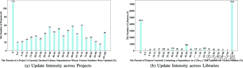 89(11.0%) 和 329(40.8%) 个项目分别更新了最多 20% 和 50% 的当前声明的库依赖项。354(43.9%) 和 101(12.5%) 个项目分别更新了超过 50% 和 80% 的当前声明的库依赖项。另一方面,4,414(32.5%) 个库在所有依赖它们的项目中从未更新过。可以看到项目的更新强度不高,尽管项目维护良好,但更新相当差。