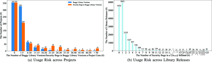 451(56.0%) 个项目采用有缺陷的库版本。328(40.7%) 个项目采用 1 到 5 个有缺陷的库版本,128(15.3%)个项目甚至使用超过 5 个有缺陷的库版本。在 25.7% 项目中,他们使用的有缺陷的库版本有 1 到 5 个安全漏洞。在 188(23.3%) 项目中,他们使用的 bug 库版本甚至有超过 10 个安全漏洞。超过一半的项目使用包含安全漏洞的库版本。三分之二的库版本包含安全漏洞。安全漏洞的相对普遍存在表明,如果项目开发人员没有意识到使用库中的安全漏洞或延迟库更新,项目将面临潜在风险。