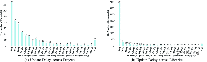 186(23.1%) 项目最多延迟 30 天更新其库依赖项。407(50.5%)、256(31.8%) 和 174(21.6%) 个项目的更新延迟分别超过 60、120 和 180 天。13.3% 个项目未包含在图 5a 中因为其无法计算更新延迟(即,90 个项目从未更新任何库依赖项;17 个项目更新了库依赖项,但我们未能抓取发布日期)。项目开发人员对新库的发布反应迟缓。如此宽的时间窗口可能会增加使用过时库的风险(例如,安全漏洞),甚至会增加更新到新版本的难度,因为在此时间窗口内将使用更多的库 API。