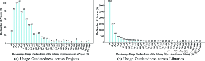 研究表明,82(10.3%) 项目使用的库平均最多与最新版本相差两个版本。306(38.0%)、118(14.6%) 和 19(2.4%) 个项目采用的库分别与最新版本平均相差超过 10、20 和 50 个版本。可以看到几乎所有的项目使用的都是过时的版本,因此这方面必然会存在功能和安全性的差距。