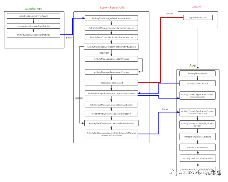 2、之后进入system server进程中的ATMS startActivity,ATMS 经过收集Intent信息,然后使用ActivityStackSupervisor.startSpecificActivityLocked,如果进程已经存在,则直接使用realStartActivityLocked,通过App的binder客户端的代理ApplicationThread调用回到bindApplication,走入Activity的启动流程;如果进程不存在则通过socket链接Zygote,请求fork新的进程;
