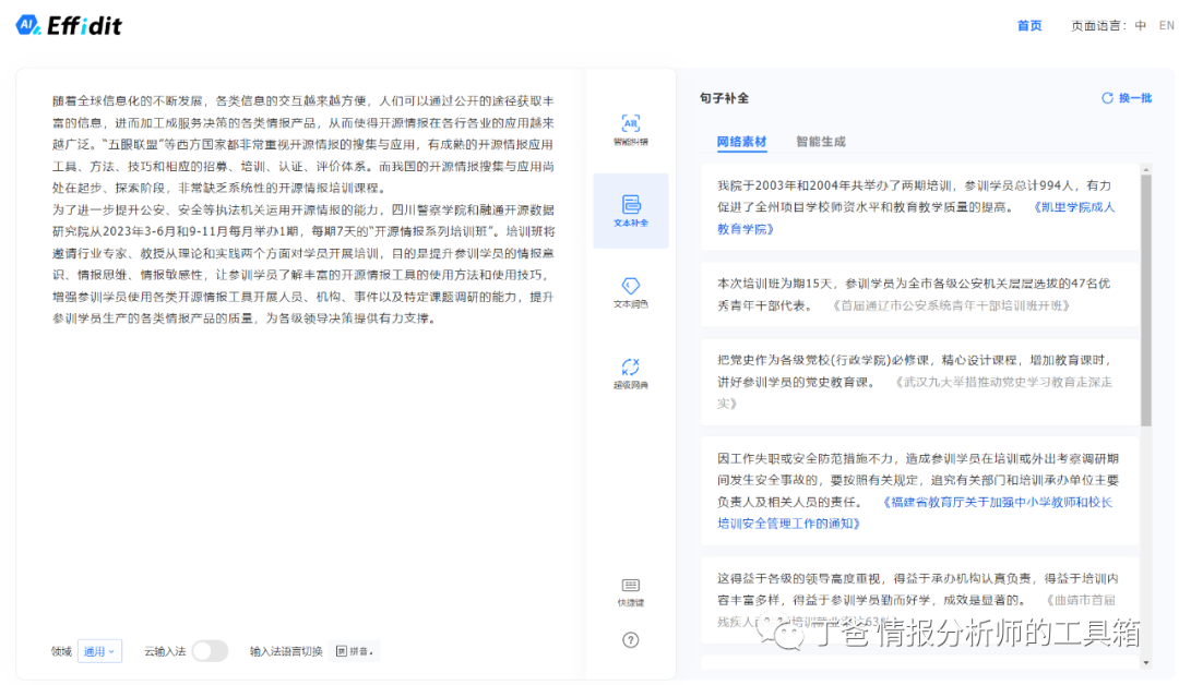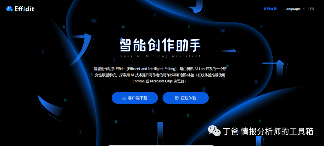 智能创作助手 Effidit(Efficient and Intelligent Editing) 是由腾讯 AI 实验室开发的一个研究性原型系统,探索用 AI 技术提升写作者的写作效率和创作体验(在线体验推荐使用 Chrome 或 Microsoft Edge 浏览器)。