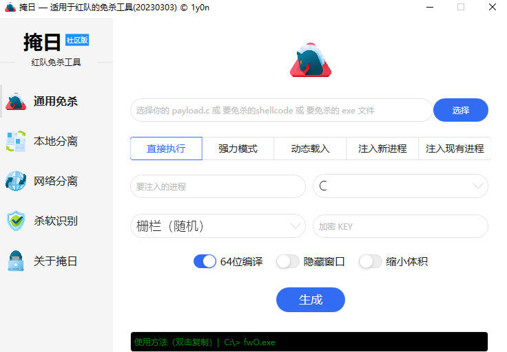 生成路径中不需要包含中文和空格,并且生成过程中尽可能关闭所有的杀毒软件,否则会生成失败!64位免杀效果远好于32位,能用64尽管用64(注意对应的shellcode也需要是64位)。针对Cobalt Strike,不要选择生成Windows分段木马、Windows无阶段木马,而是生成payload,最终是一个payload.c文件。