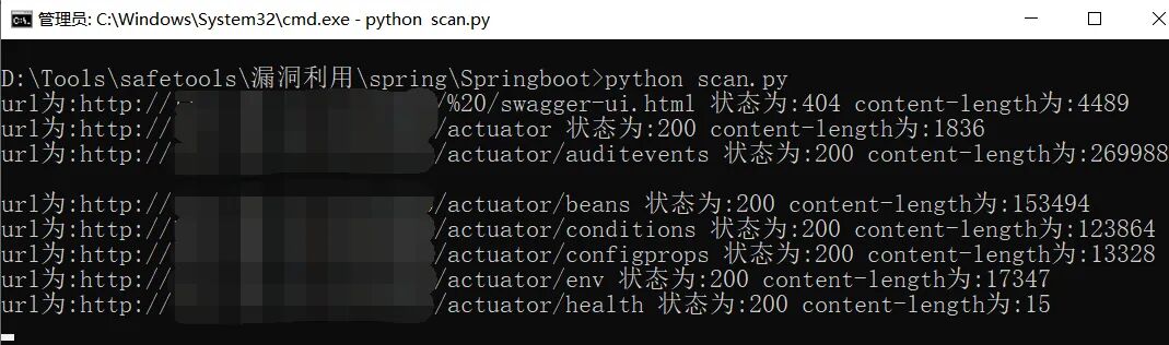 import requestsimport timewith open("url.txt", 'r') as temp:for url in temp.readlines():url = url.strip('\n')with open("SpringBoot信息泄露目录字典.txt", 'r') as web:webs = web.readlines()for web in webs:web = web.strip()u = url + webr = requests.get(u)print("url为:" + u + ' ' + "状态为:%d"%r.status_code + ' ' + "content-length为:" + str(len(r.content)))