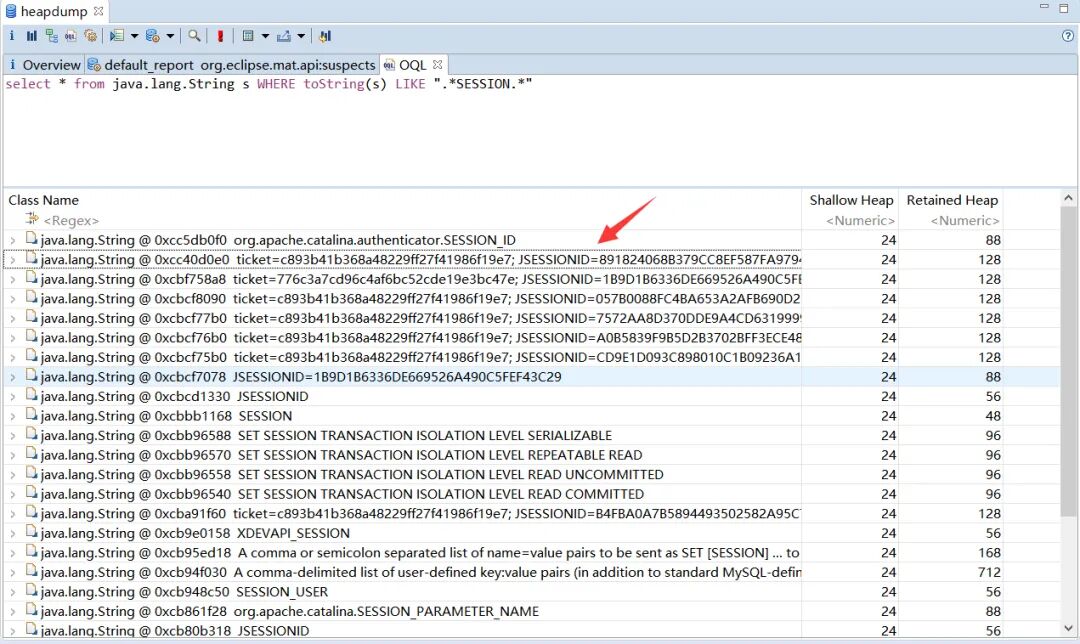 select * from java.lang.String s WHERE toString(s) LIKE ".*SESSION.*"https://github.com/wyzxxz/heapdump_tool加载heapdump文件,选择1模式加载文件中所有的对象