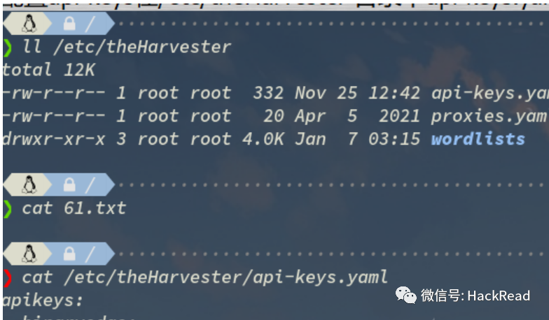 配置api-keys在/etc/theHarvester 目录下api-keys.yaml填入对应的api key即可
