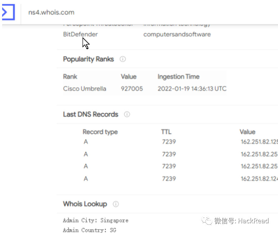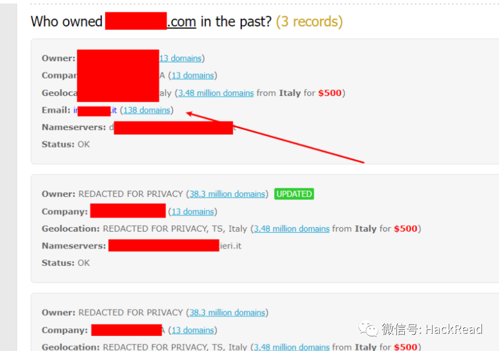 whois需要查询域名的whois,然后根据whois信息来查询历史和反查,这样你就得到了一些邮箱和可疑域名。