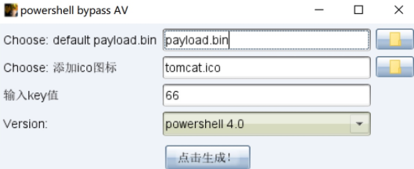 3、选择刚才生成的bin文件、ico图标,以及powershell的版本,点击即可生成exe可执行文件