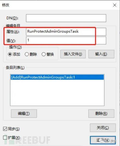 当域控为Windows Server 2008 R2或Windows Server 2012及以上时,点击浏览 -> 修改,在属性选项卡中输入 RunProtectAdminGroupsTask ,在值字段输入 1。操作选择添加,然后点击输入,最后运行即可。