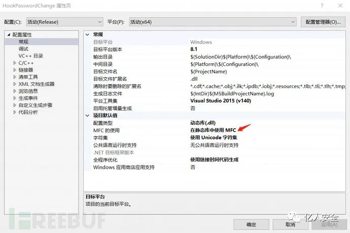 ① 生成 DLL 文件,需在项目属性中将MFC的使用设为 ”在静态库中使用MFC“