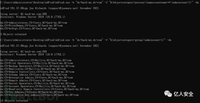 Adfind.exe -b "dc=hack-my,dc=com" -f "&(objectcategory=person)(samaccountname=*)(admincount=1)" -dn
