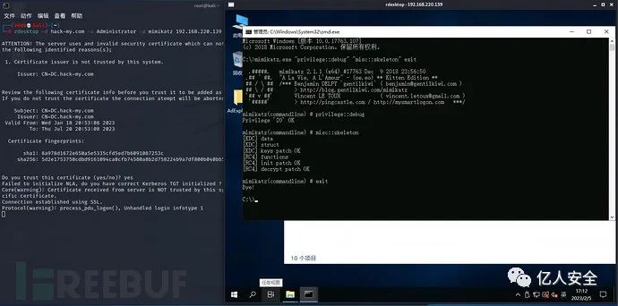 执行后,将成功创建 Skeleton Key 域后门,为所有的域账户设置一个相同的密码 “mimikatz”,从而使其他机器可以成功登录域控。