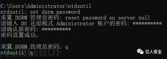 在域控上,DSRM 账户实际上就是本地管理员账户(Administrator),并且该账户的密码在创建后几乎很少使用。通过在域控上运行 NTDSUtil,可以为 DSRM 账户修改密码,相关命令如下:
