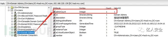 在活动目录中,属性 adminCount 用来标记特权用户和组。对于特权用户和组来说,该属性值被设为 1。
