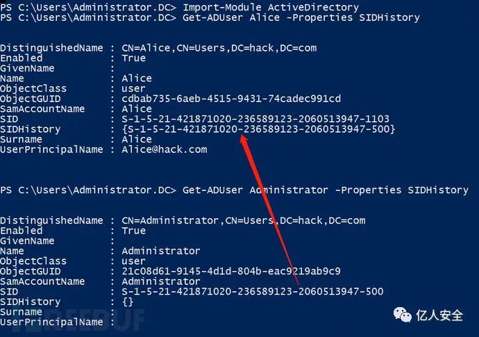 ③ 通过 Powershell 查看 Alice 用户的属性,可以发现其 SID History 属性值已经与 Administrator 用户的 SID 相同,这说明 Alice 用户将继承 Administrator 用户的所有权限。