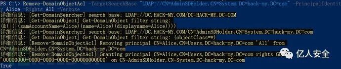 Remove-DomainObjectAcl -TargetSearchBase "LDAP://CN=AdminSDHolder,CN=System,DC=hack-my,DC=com" -PrincipalIdentity Alice -Rights All -Verbose